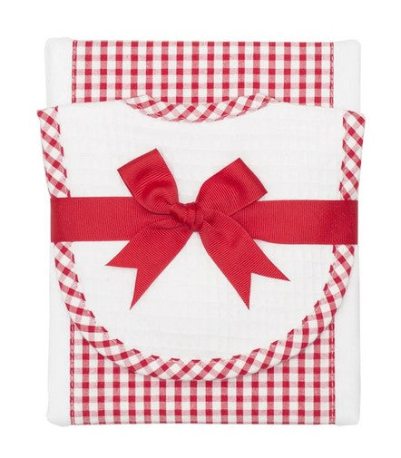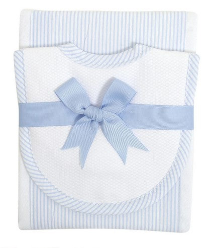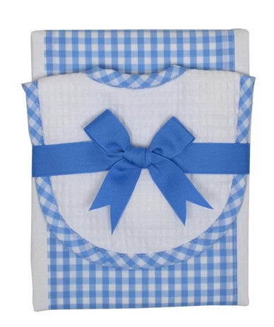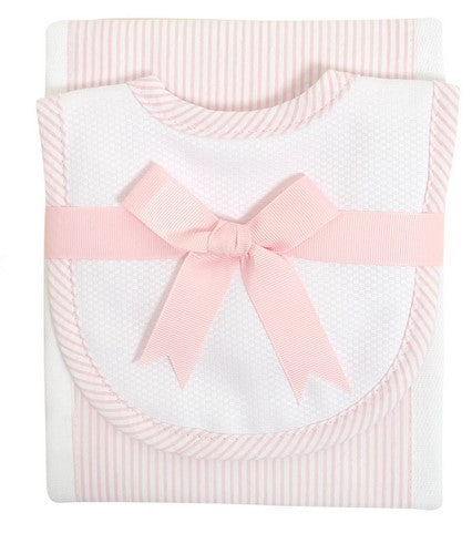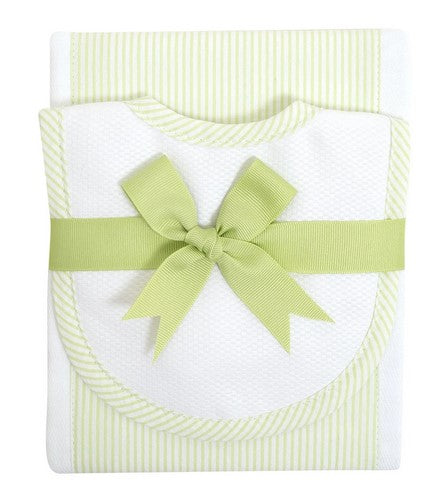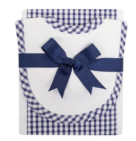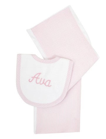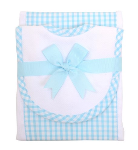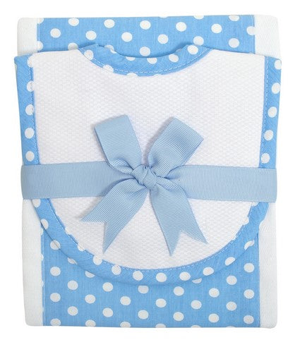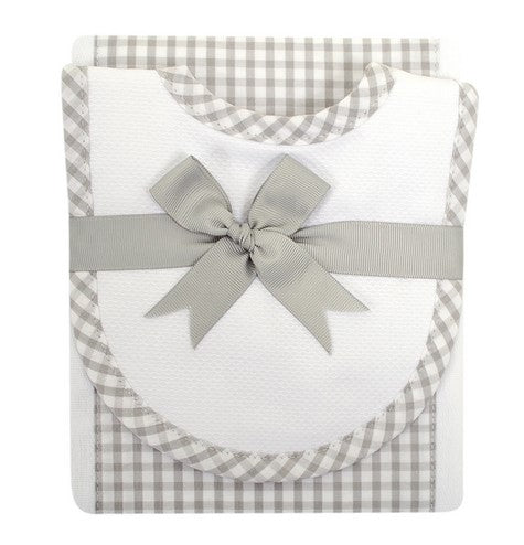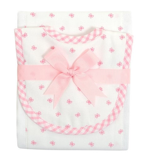 The popular newborn feeding set features a super absorbent burp cloth with a fabric panel sewn down the middle and a small bib backed with 100% cotton terry. This extra thick bib is the perfect size for little droolers and early feedings. This set comes tied with a gorgeous grosgrain bow; ready for gifting!