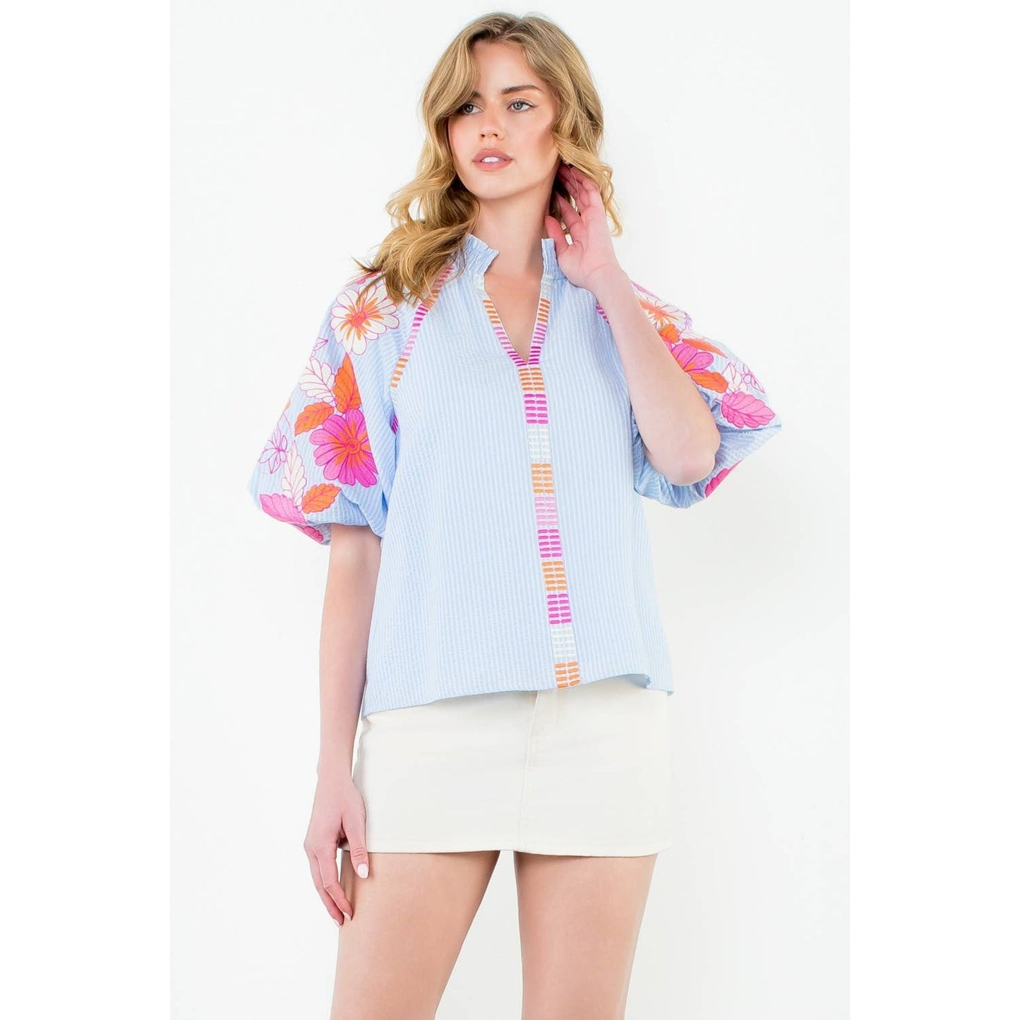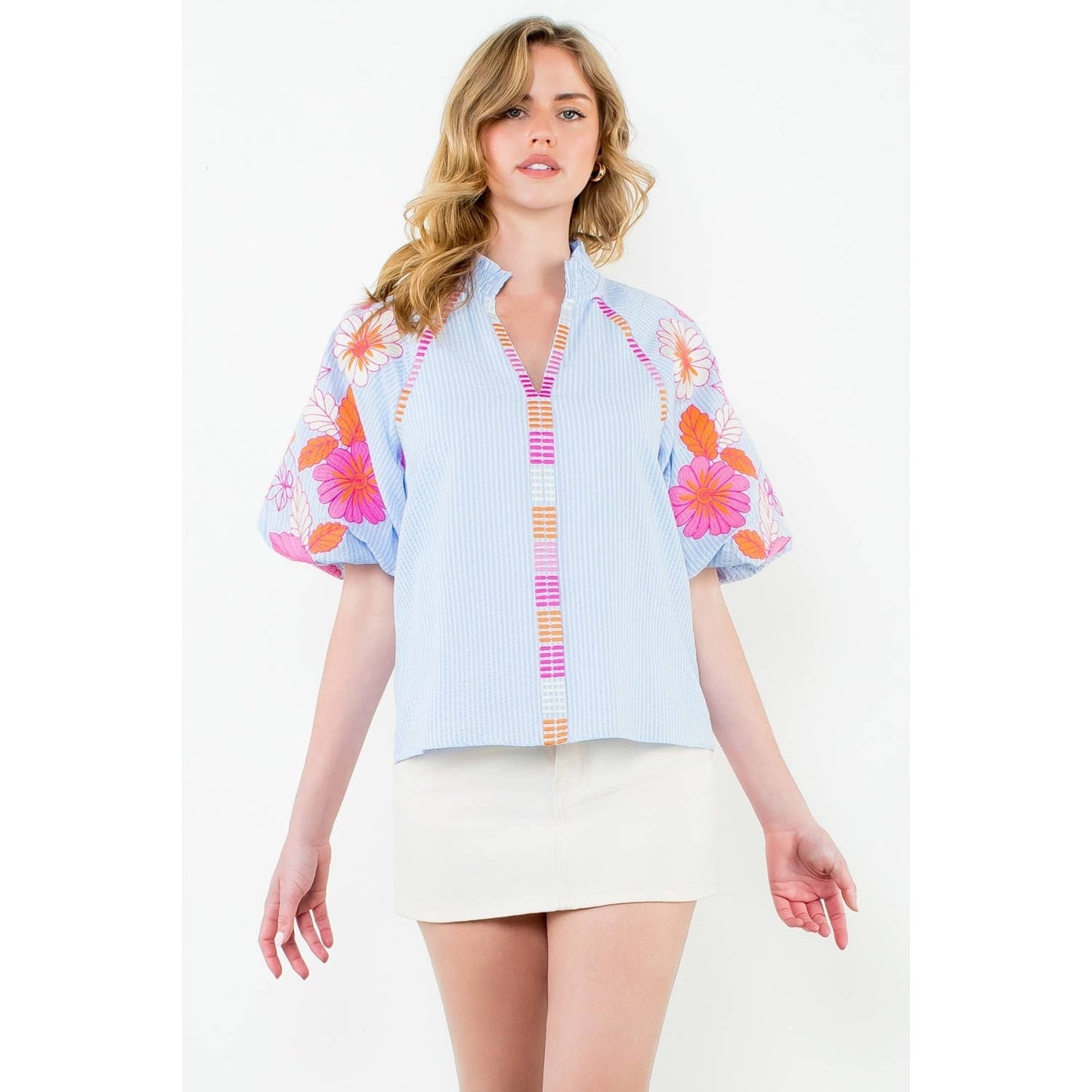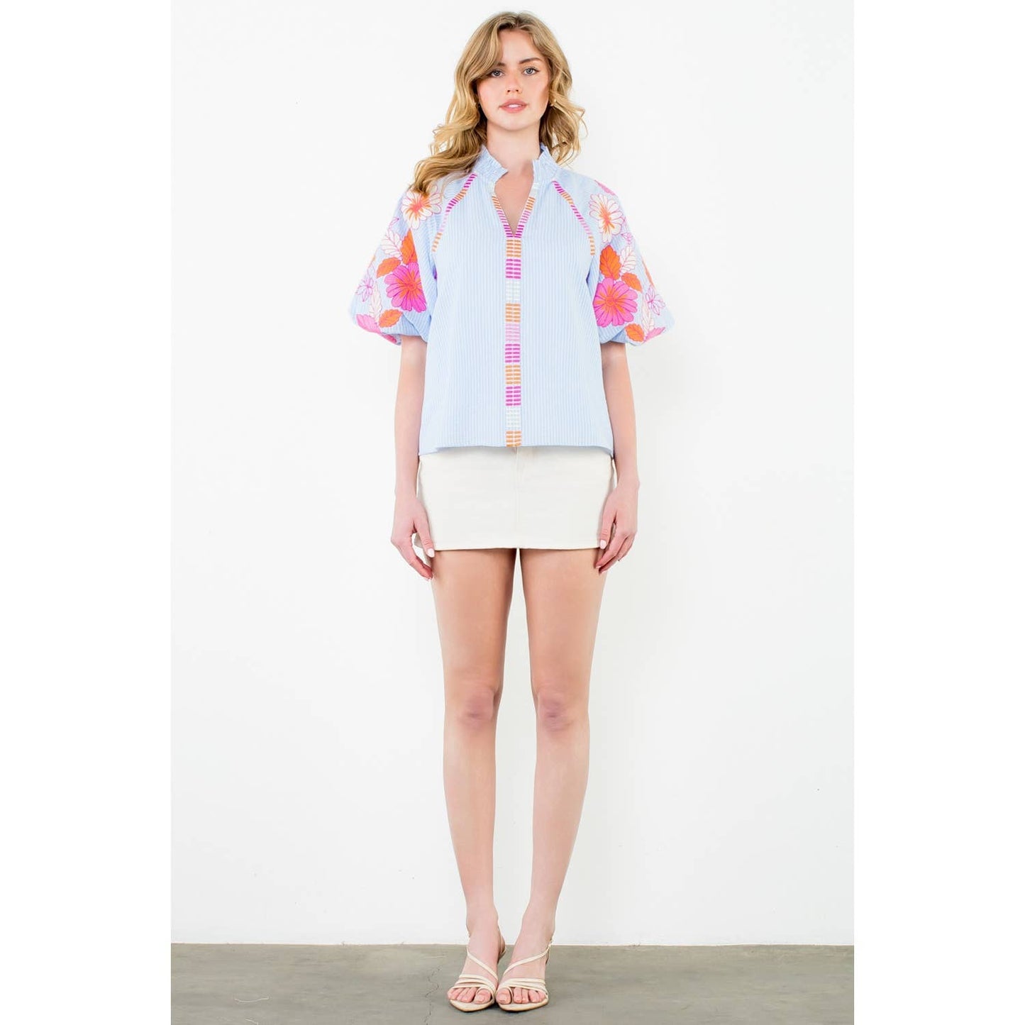 Floral Embroidered Puff Sleeve Striped Top . / Style Measurements for Size S / Designed in USA - Body Length: 24 in - Bust Width: 39 in - Sleeve Length: 16 3/4 in . / Model Sizes - Wearing Size S - Height 5' 9", Bust 32", Waist 25 1/2", Hips 36" . Fabric Content - WOVEN / 50% Rayon, 50% Polyester
