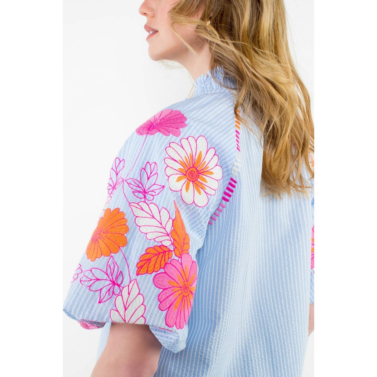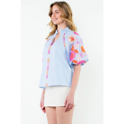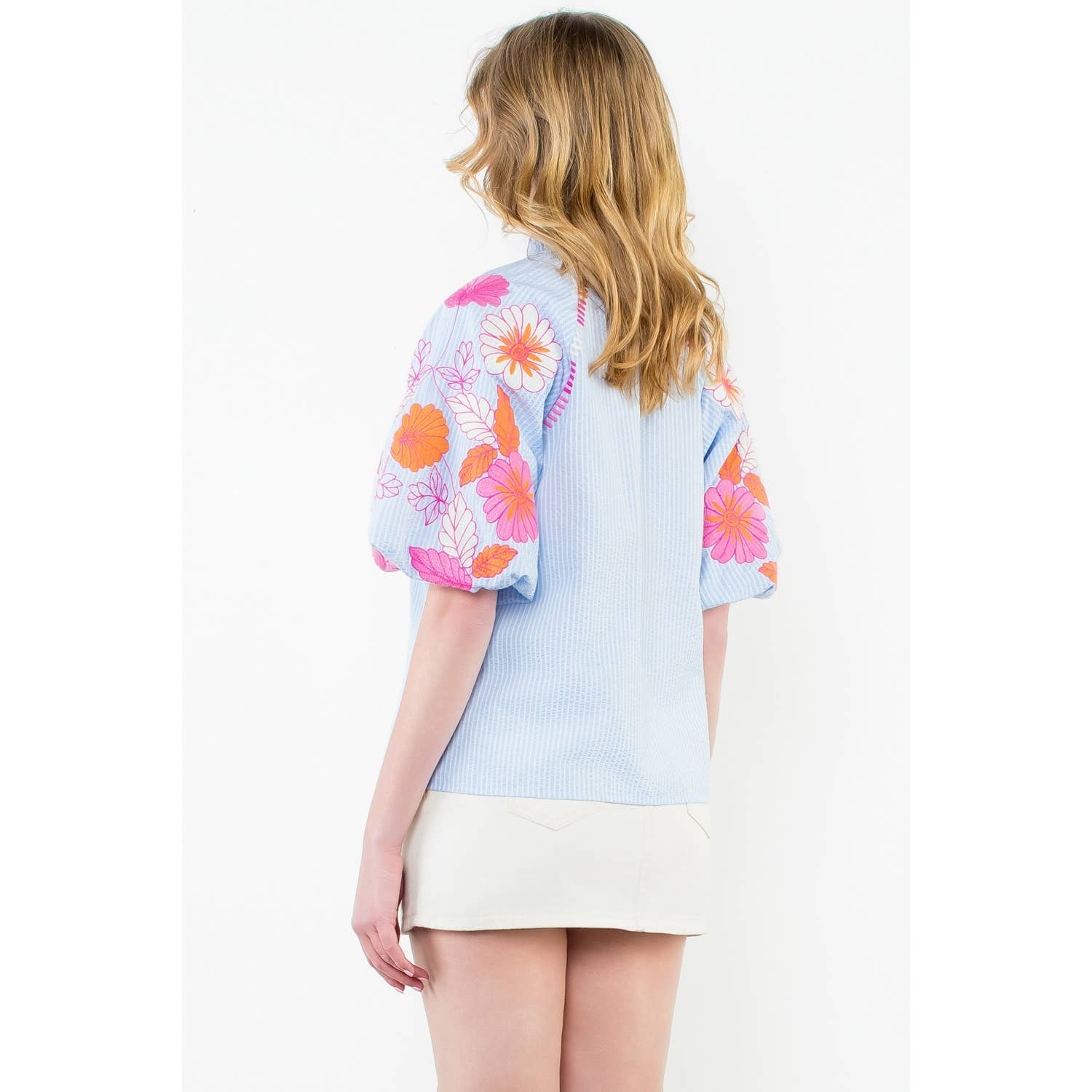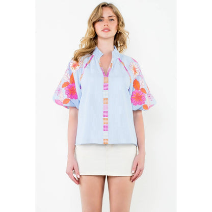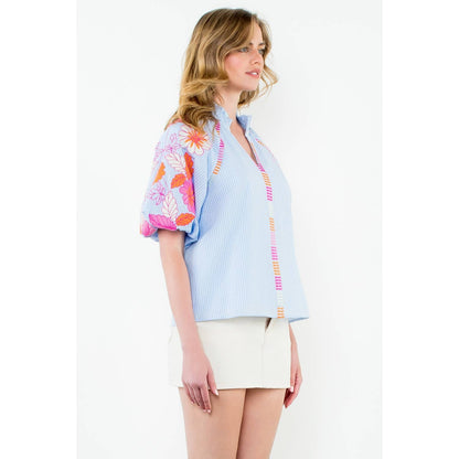 Floral Embroidered Puff Sleeve Striped Top . / Style Measurements for Size S / Designed in USA - Body Length: 24 in - Bust Width: 39 in - Sleeve Length: 16 3/4 in . / Model Sizes - Wearing Size S - Height 5' 9", Bust 32", Waist 25 1/2", Hips 36" . Fabric Content - WOVEN / 50% Rayon, 50% Polyester