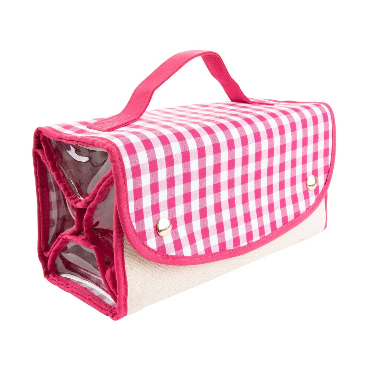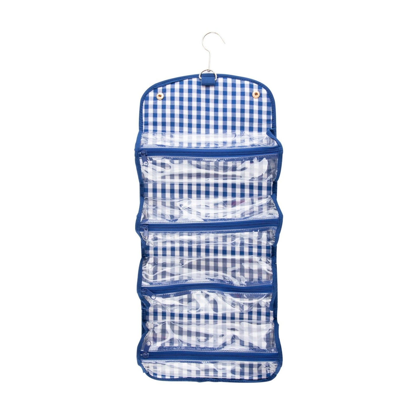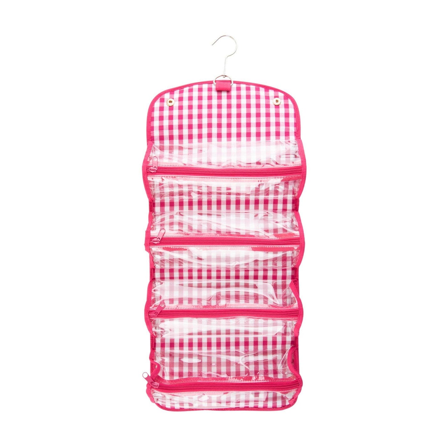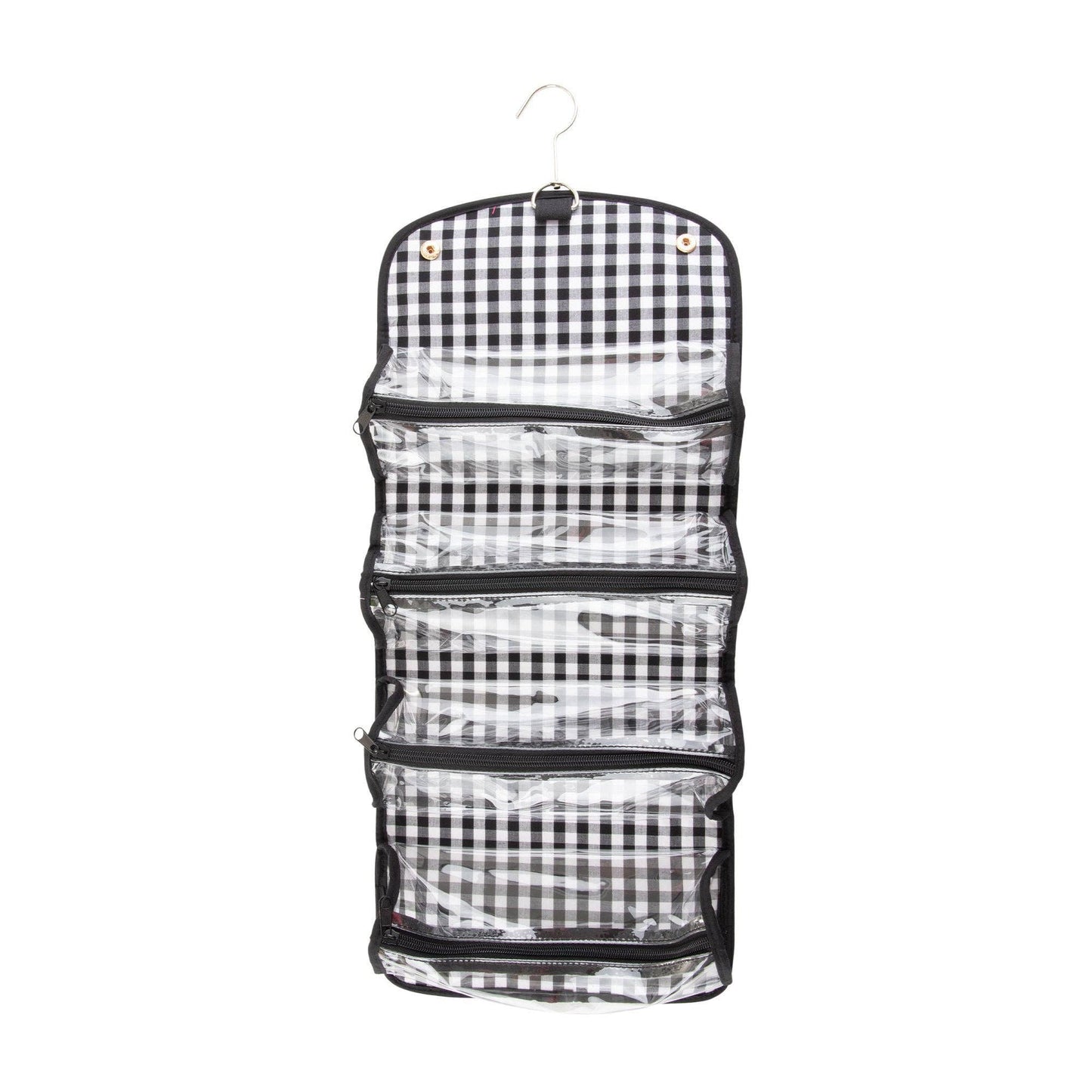 Roll it up with our new favorite travel bag - the Roll Up Cosmetic! The cosmetic case will hold it all with its 4 clear zippered pockets help organize your toiletry items while the metal hanger lets this bag hang from almost anywhere! These are perfect for traveling or using in college dorm bathrooms where space is limited! Featuring our cotton gingham fabric and durable canvas material.