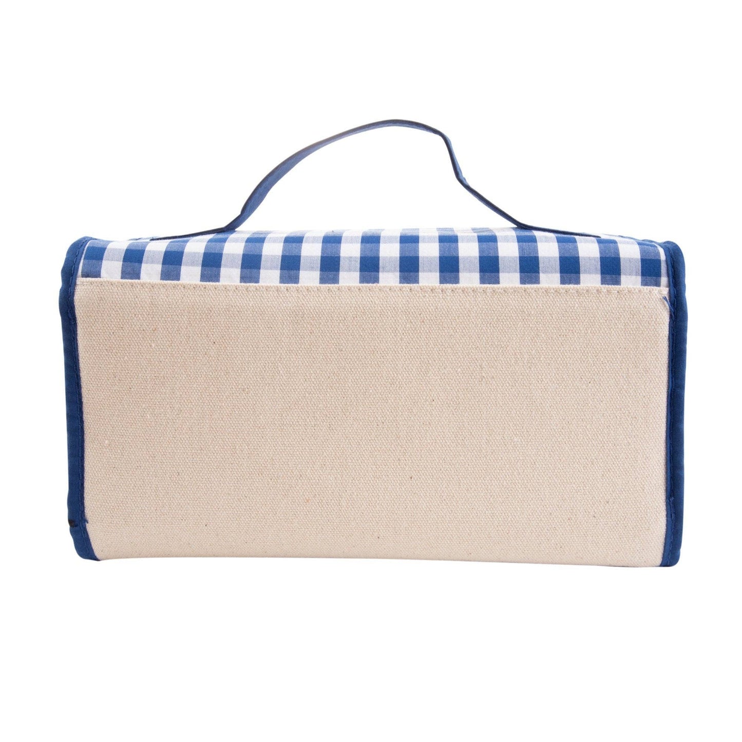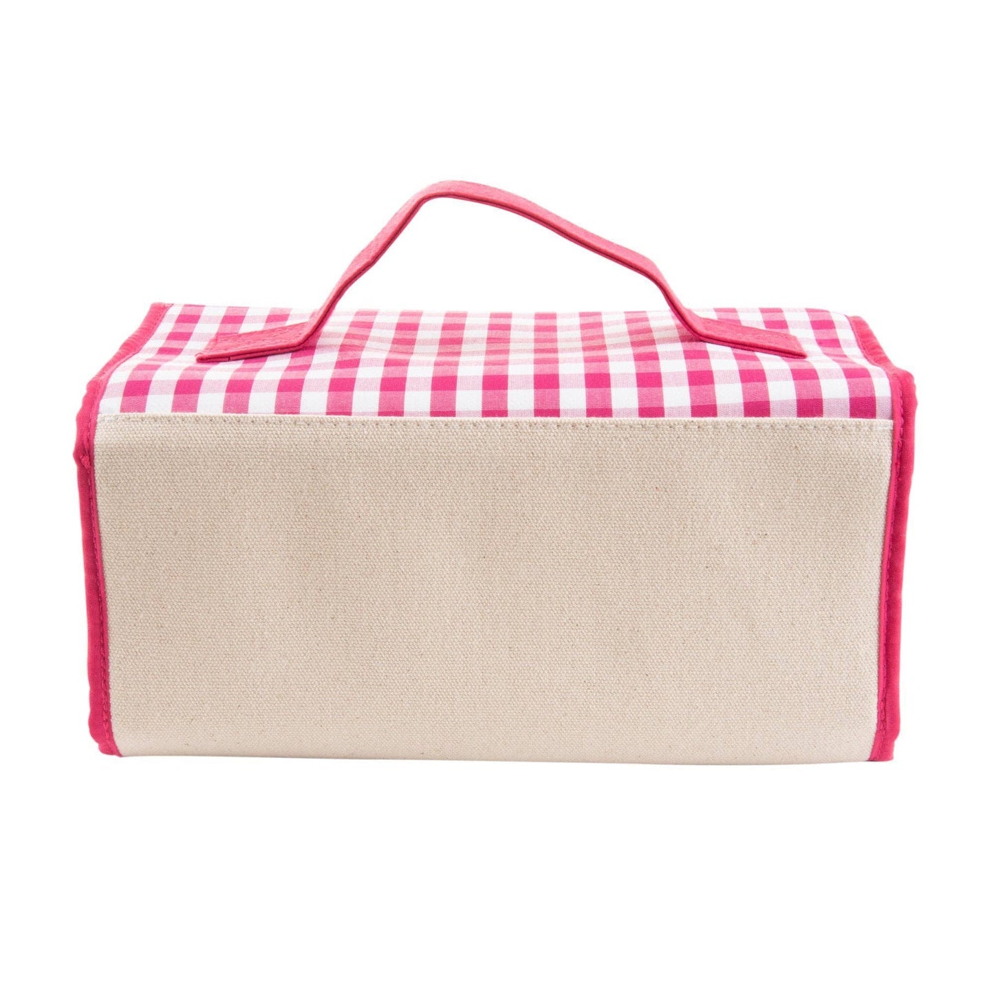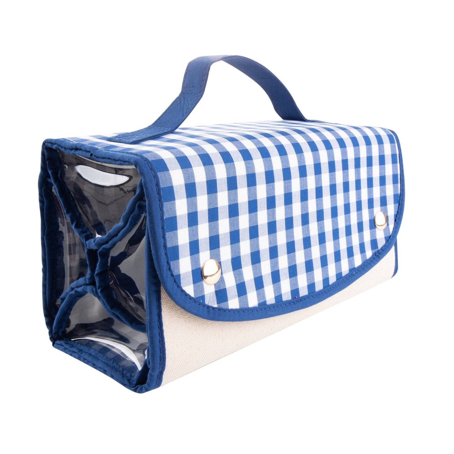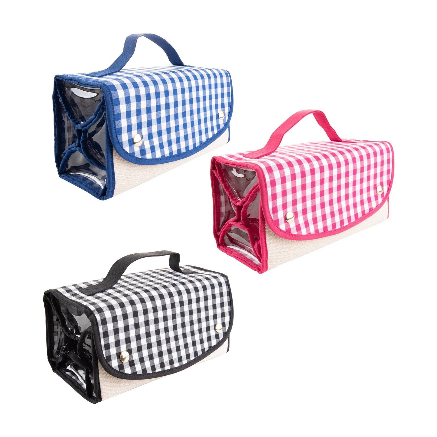 Roll it up with our new favorite travel bag - the Roll Up Cosmetic! The cosmetic case will hold it all with its 4 clear zippered pockets help organize your toiletry items while the metal hanger lets this bag hang from almost anywhere! These are perfect for traveling or using in college dorm bathrooms where space is limited! Featuring our cotton gingham fabric and durable canvas material.