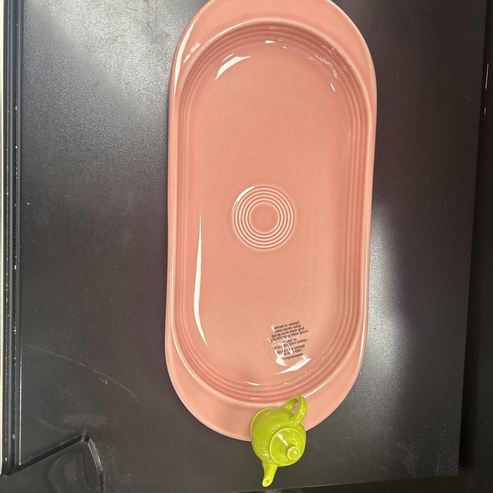 The Nora Fleming pink Fiesta bread tray is a limited-edition stoneware collaboration with Fiesta Dinnerware, featureing a vibrant Peony Pink color. These durable, dishwasher, microwave, and oven-safe trays measure around 13.5-14 inches long and are collectible pieces known for their iconic design and compatibility with Nora Fleming's minis