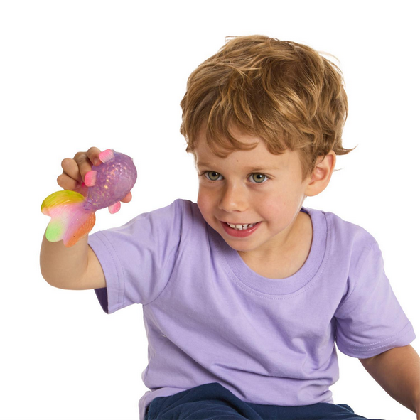 - Features a super squishy material with glitter accents