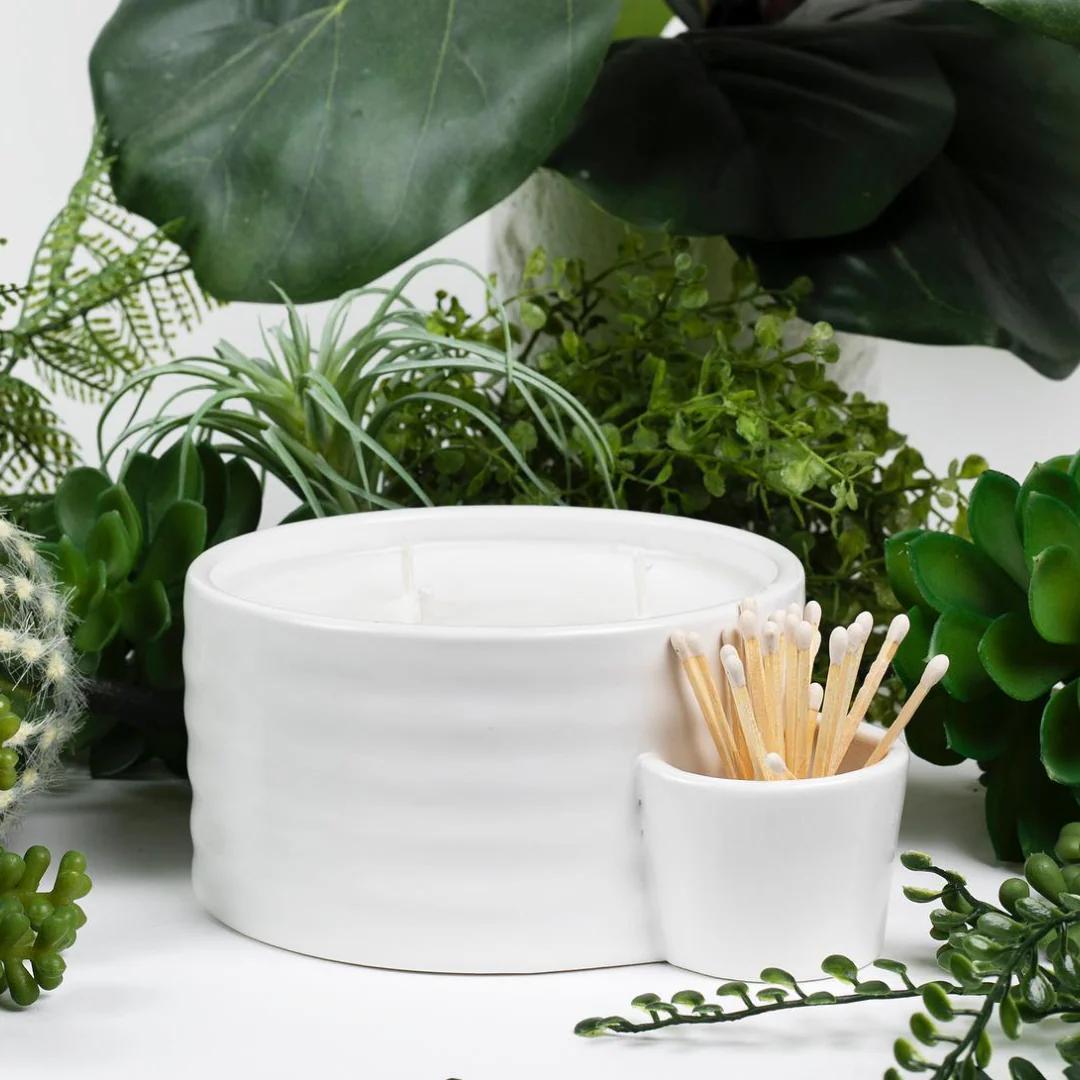 We have the perfect match! The perfect match candle is a handmade ceramic matte white vessel with an attached match holder and matches. The result is a fragrance that is raw, yet refined. This unique vessel is definitely a conversation piece. After the candle has burnes, the vessel can also be used as a plant holder for you to enjoy also. 100% all-natural soy wax Burns 80 to 90 hours. 20 oz