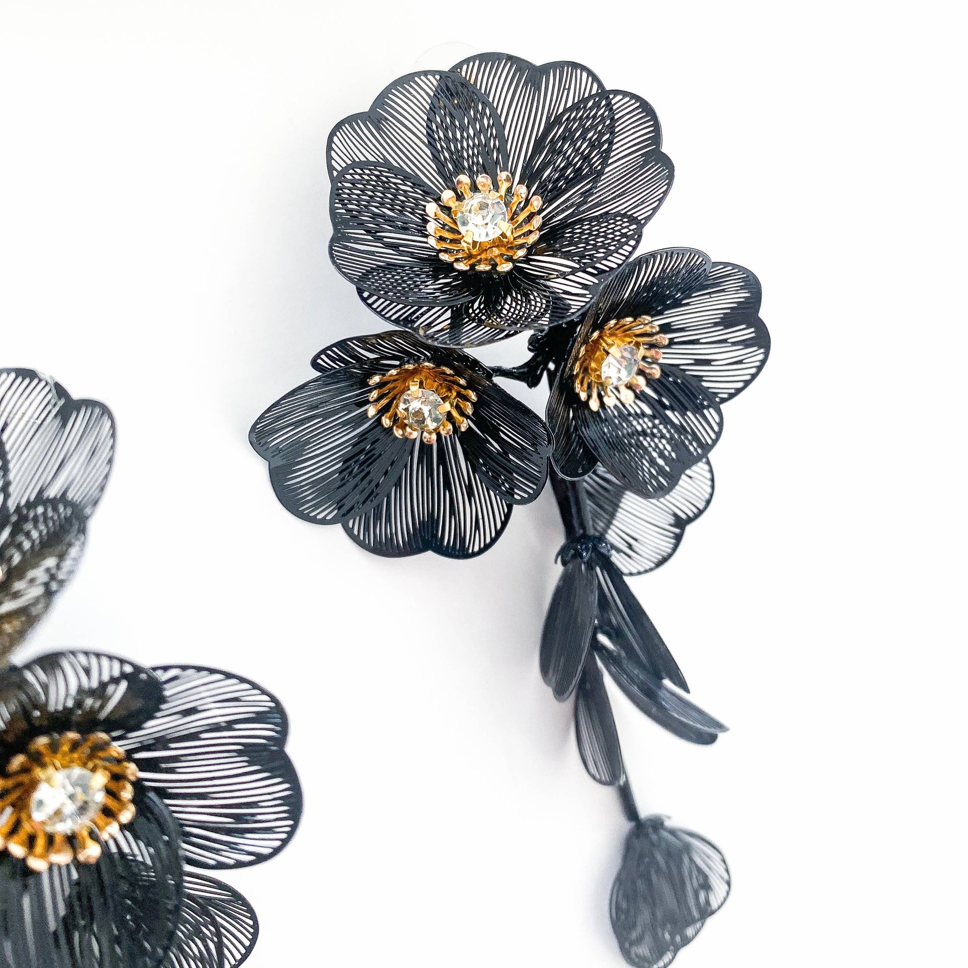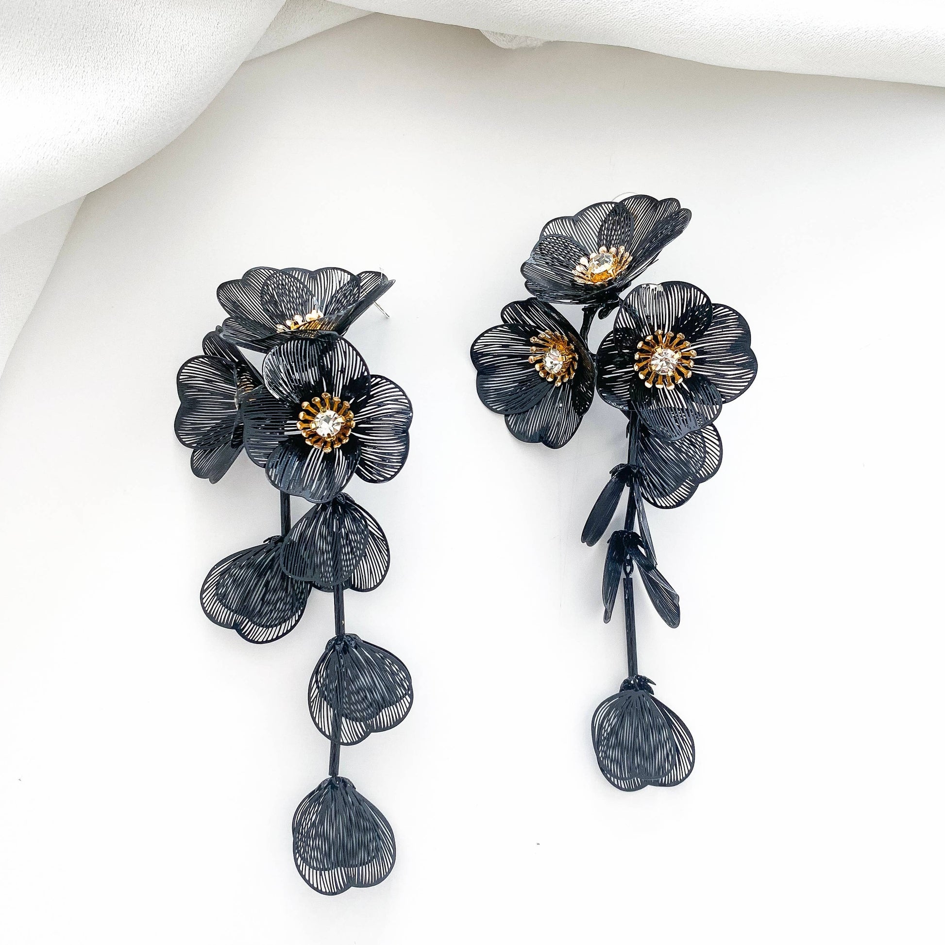 Make a statement with these Waterfall Statement Black Flower Earrings. Perfect for parties and special occasions, their head-turning design is sure to make an impact. Lightweight and comfortable to wear all day, you'll love the way they add a touch of elegance to any outfit.